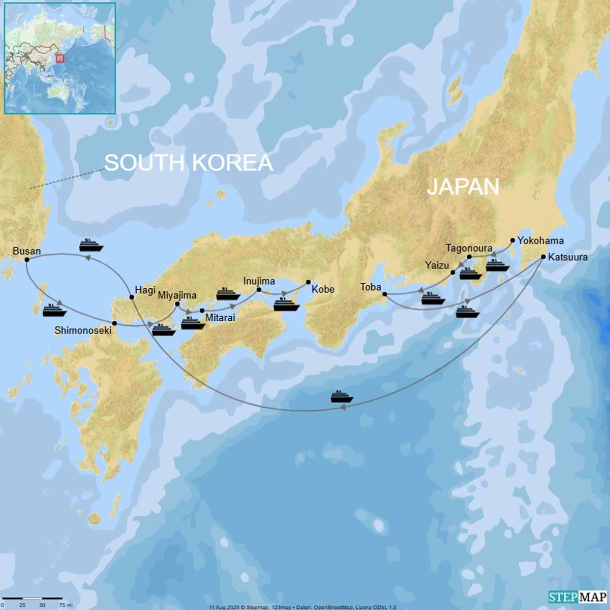 Yokohama, Tagonoura, Yaizu, Toba, Katsuura, Hagi, Busan, Shimonoseki, Miyajima, Inujima, Kobe