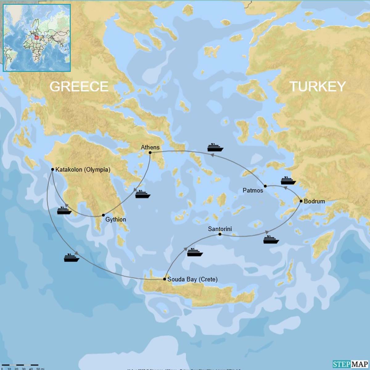 Athens, Gythion, Olympia, Crete, Santorini, Bodrum, Patmos